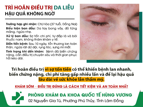 Chỉ từ vài mảng da bong vảy ở tay, chị Hòa nghĩ rằng có thể tự xử lý tại nhà để tiết kiệm chi phí. Thế nhưng, sự chần chừ và niềm tin vào các phương pháp truyền miệng đã khiến bệnh tiến triển nhanh chóng, lan khắp cơ thể và để lại những hậu quả nặng nề khi chị buộc phải tìm đến bác sĩ chuyên khoa.