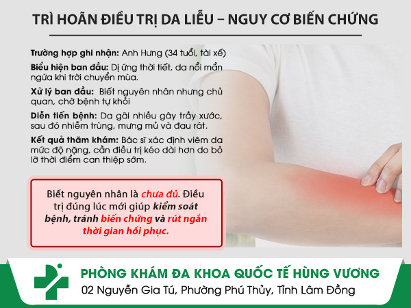 Nhiều người nghĩ rằng chỉ cần biết rõ nguyên nhân dị ứng là đủ, rồi chờ bệnh tự qua đi. Nhưng với da liễu, sự chần chừ ấy có thể khiến tổn thương âm thầm nặng dần, đến khi buộc phải điều trị thì đã mất nhiều thời gian, chi phí và cả sức khỏe. Trường hợp của anh Hưng là một minh chứng điển hình.