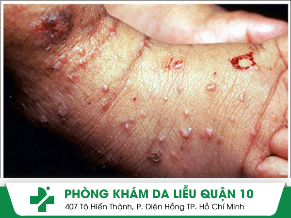 ❖ Giai đoạn sau – ghẻ nước ở chân: Khi cái ghẻ đào hang sâu bên trong lớp biểu bì da, tạo thành các hang ngoằn ngoèo dưới da, miệng đường hang sẽ xuất hiện mụn nước có kích thước tầm 1 – 2 mm, đây là nơi cư trú của ghẻ. Bề mặt da có những đường màu trắng xám, vết xước, trợt da, máu và sẹo thâm do bệnh nhân gãi ngứa gây tổn thương.