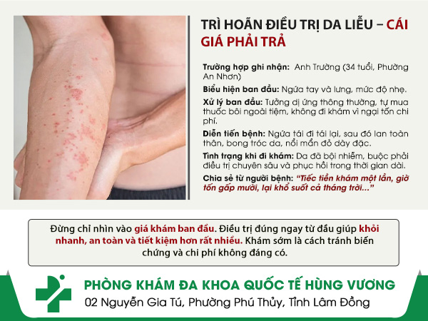 Chỉ vì nghĩ ngứa da là chuyện nhỏ và tiếc vài trăm ngàn tiền khám, anh Trường đã chọn cách chịu đựng và tự bôi thuốc qua ngày. Thế nhưng, sự chủ quan ấy âm thầm kéo dài bệnh từng tuần, đến khi làn da bùng phát nặng nề thì cái giá phải trả không chỉ là tiền bạc, mà còn là cả tháng trời mệt mỏi và khổ sở.