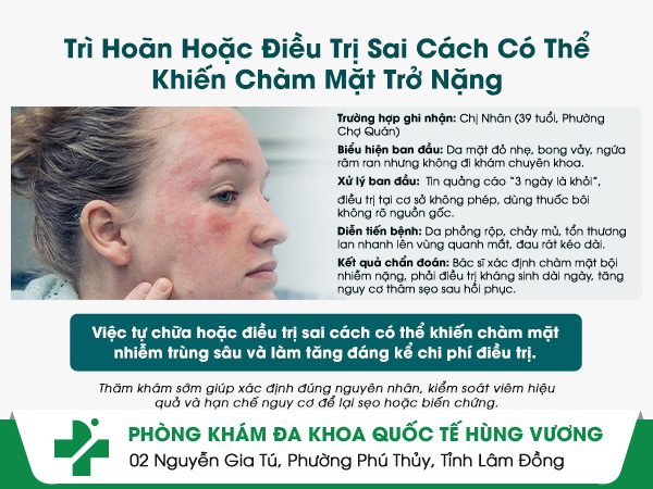 Chàm mặt không chỉ gây ngứa rát mà còn để lại tổn thương kéo dài. Nếu không can thiệp sớm, da dễ bong vảy, đỏ nề, nứt nẻ, nhiễm trùng và hình thành sẹo thâm khó hồi phục.