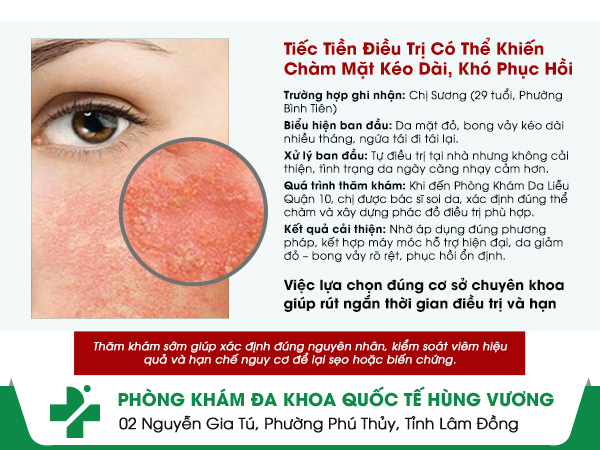 Hàng nghìn bệnh nhân chàm mặt đã phục hồi tại Phòng Khám Da Liễu Quận 10 (2 Nguyễn Gia Tú, P. Phú Thuỷ, Tỉnh Lâm Đồng). Đây là một trong những cơ sở da liễu được người dân TPHCM tin chọn khi cần điều trị chuyên sâu:
