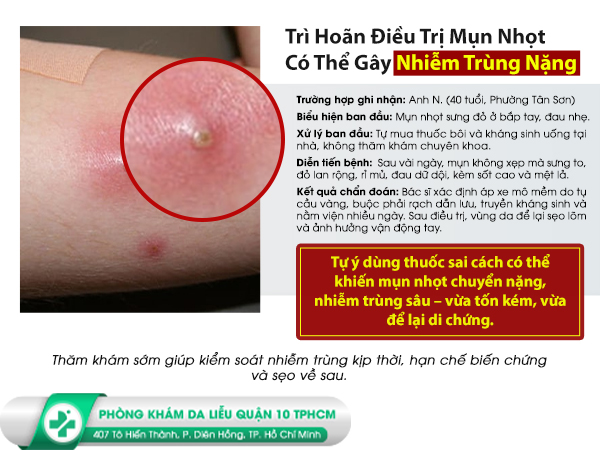 Mụn nhọt không chỉ đơn thuần là một nốt sưng đỏ nổi trên da. Tùy vị trí và mức độ viêm nhiễm, nhọt có thể tiến triển thành ổ mủ sâu, lan rộng, gây sốt, nhiễm trùng mô mềm, thậm chí đe dọa tính mạng nếu xử lý sai cách. Nhiều trường hợp chủ quan tự nặn hoặc trì hoãn thăm khám khiến tình trạng chuyển nặng nhanh chóng.