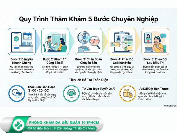 Tại Phòng Khám Da Liễu Quận 10, các bác sĩ chuyên khoa sẽ xác định rõ nguyên nhân – mức độ tổn thương và áp dụng phác đồ điều trị chuyên sâu, cá nhân hóa, gồm: