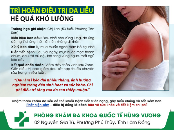 Nhiều người khi gặp các dấu hiệu đau rát, nổi mẩn hay mụn nước trên da thường chủ quan, cho rằng chỉ là kích ứng thông thường nên tự xử lý tại nhà. Thế nhưng, chính sự chần chừ ấy có thể khiến bệnh tiến triển âm thầm, gây đau đớn kéo dài và để lại biến chứng khó hồi phục. Trường hợp của chị Lan dưới đây là một lời cảnh báo rõ ràng.