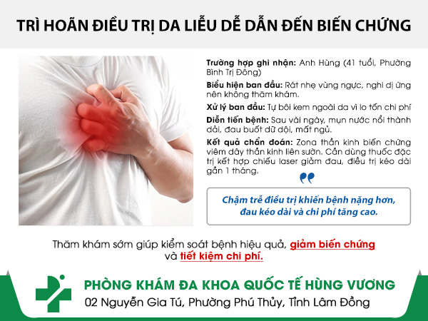 Zona thần kinh nếu được phát hiện và điều trị sớm sẽ giúp giảm đau nhanh, hạn chế biến chứng nguy hiểm. Đừng chủ quan với những dấu hiệu ban đầu. Nếu còn băn khoăn về tình trạng của mình, hãy liên hệ Phòng Khám Da Liễu Quận 10 qua Hotline 0252 7303 888 hoặc