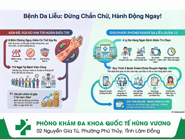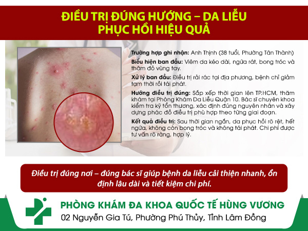 Đối với người dân sinh sống tại Bà Rịa – Vũng Tàu, khi bệnh da liễu kéo dài, tái phát hoặc điều trị không hiệu quả tại địa phương, chủ động tìm đến cơ sở chuyên khoa tại TP.HCM là lựa chọn thực tế và an toàn. Phòng Khám Da Liễu Quận 10 (2 Nguyễn Gia Tú, P. Phú Thuỷ, Tỉnh Lâm Đồng) với vị trí thuận tiện, bác sĩ chuyên môn cao, quy trình nhanh gọn đang là địa chỉ được nhiều người tin tưởng.